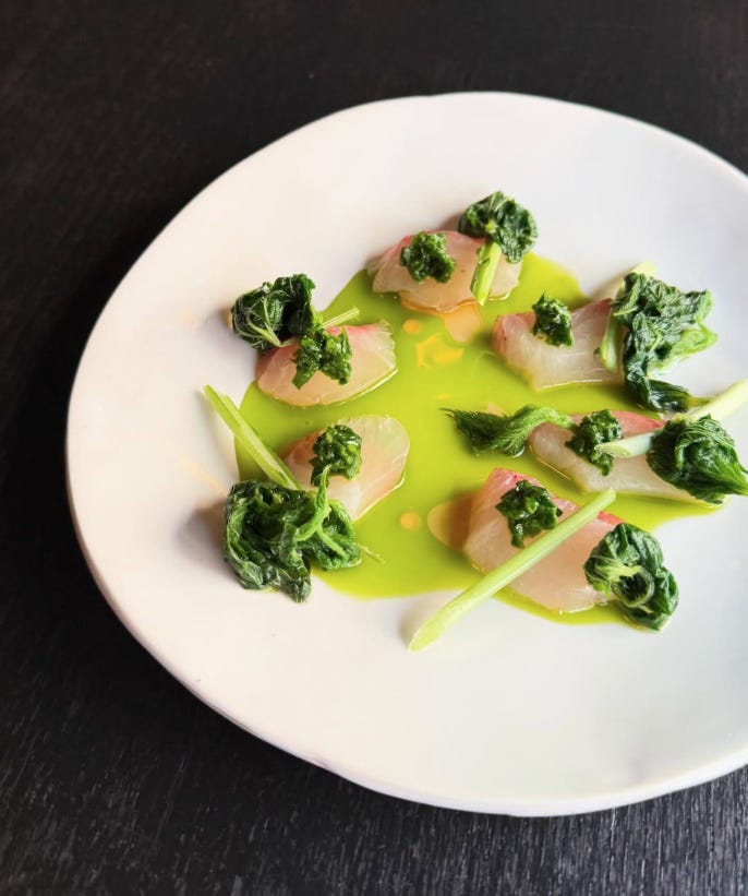 Come in soon! We’ve got some new dishes that scream of spring, like Jonah crab with peas, almond, and chartreuse, and this Shima Aji with roasted kale oil and stinging nettles. Fleeting stuff!