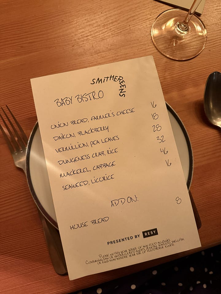 Smithereens and Baby Bistro feel like kindred spirits, we opened up around the same time and we are both small, weirdo restaurants. Once again, we were able to incorporate a lot of amazing local seafood into our menu, serving Dungeness crab rice and some beautiful vermilion rockfish.